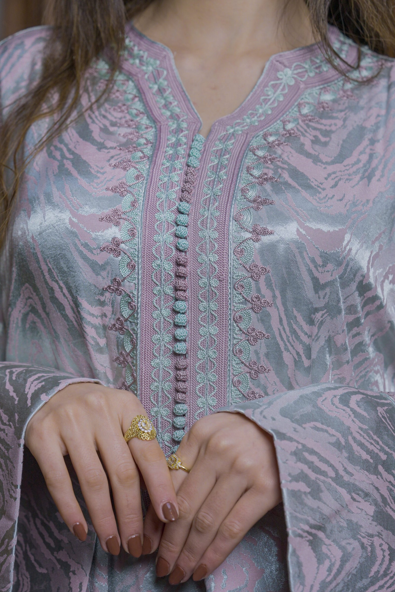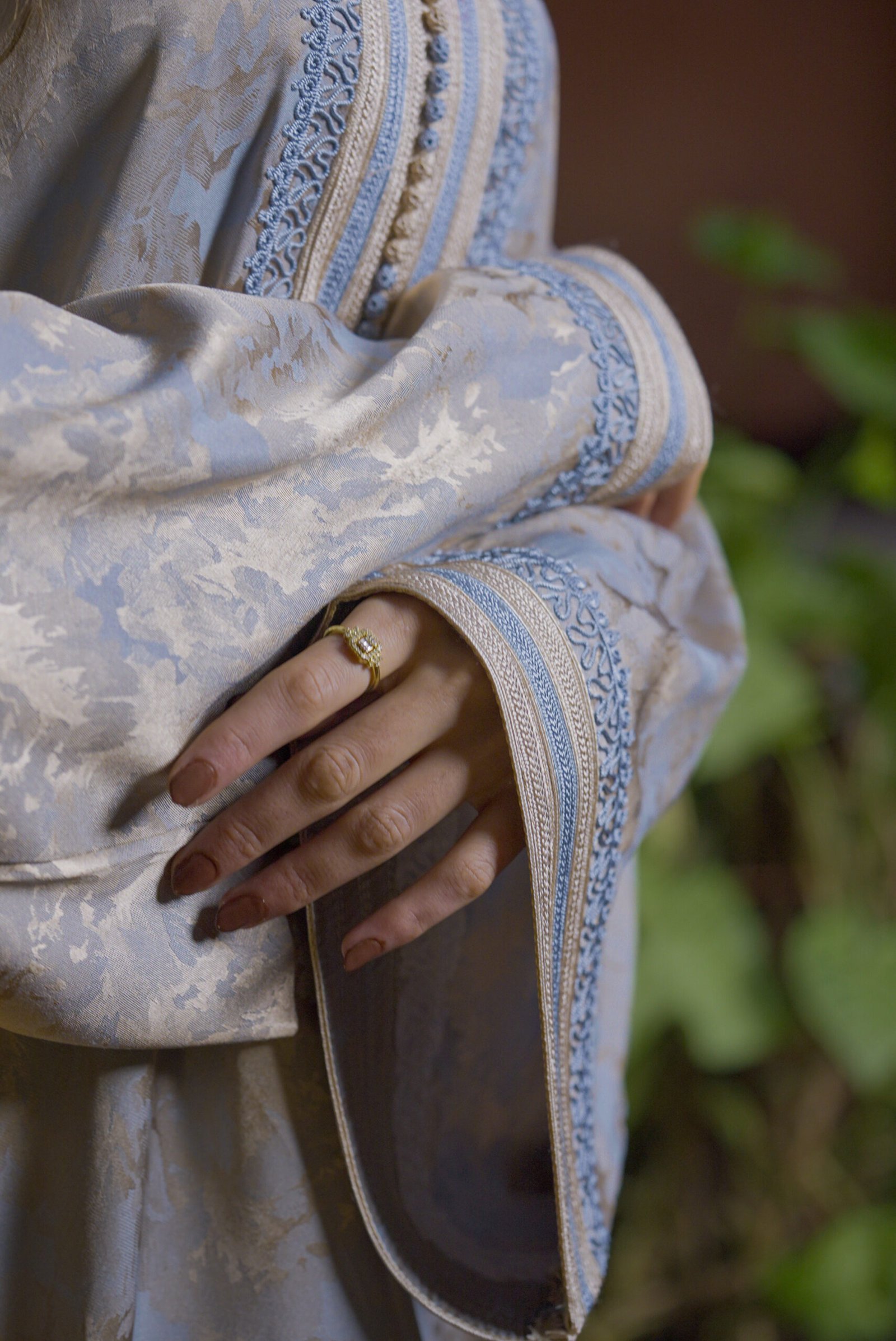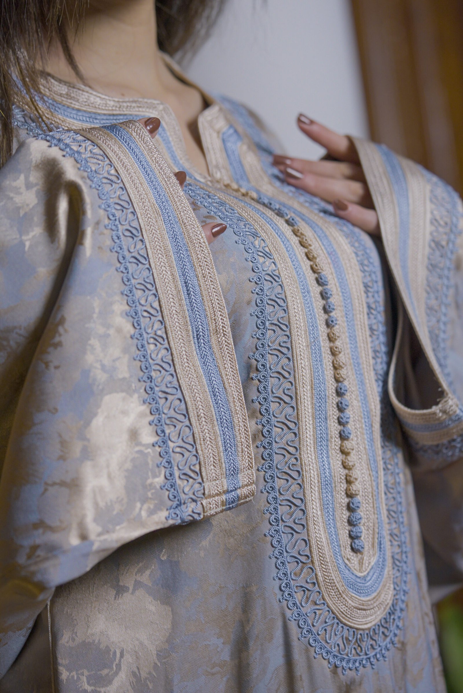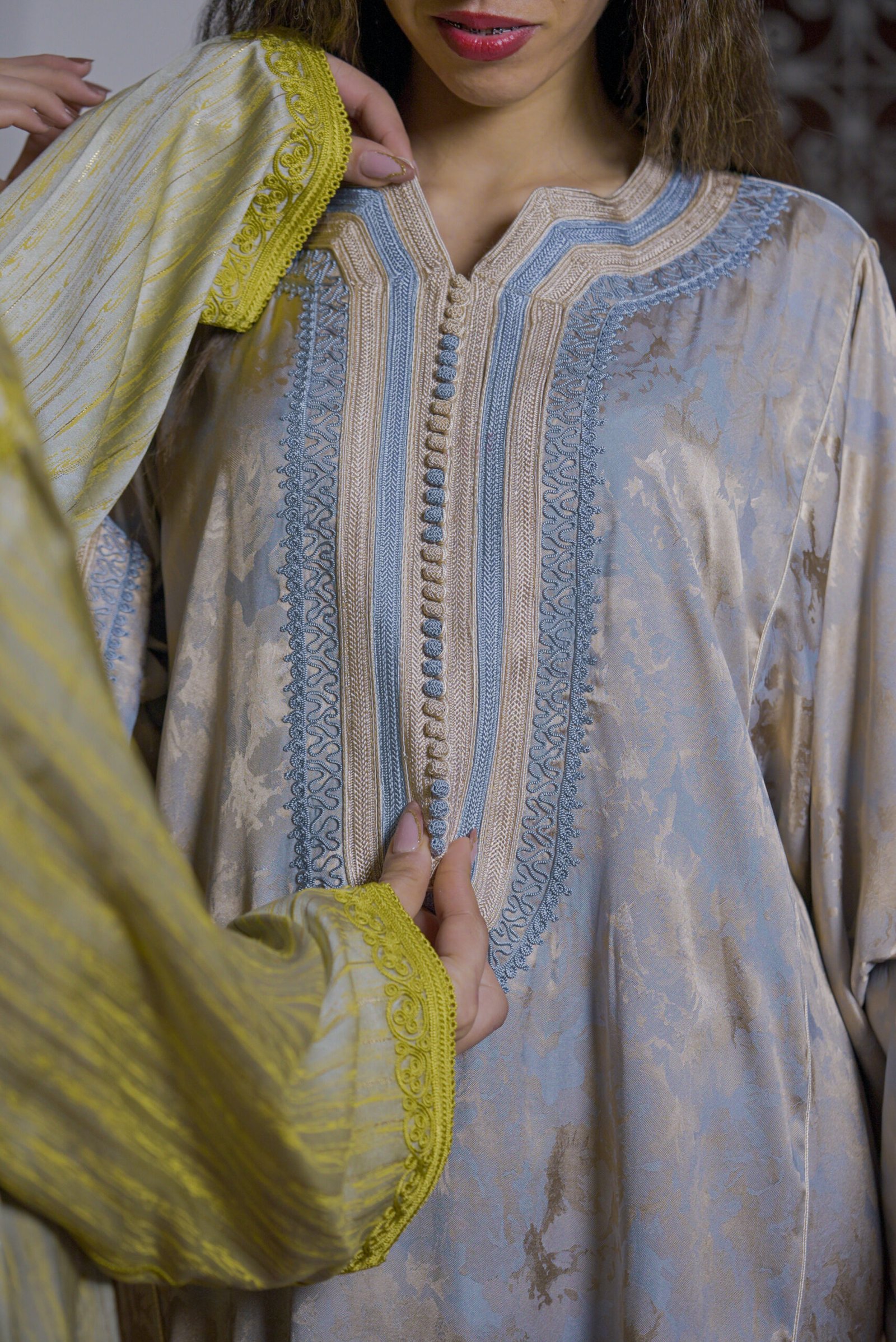 Sublimez vos occasions spéciales avec ce caftan d’exception, une pièce unique qui allie la noblesse du tissu brocart à la finesse de l’artisanat marocain. Sa coupe fluide et ses reflets dorés délicats offrent une allure royale et intemporelle.